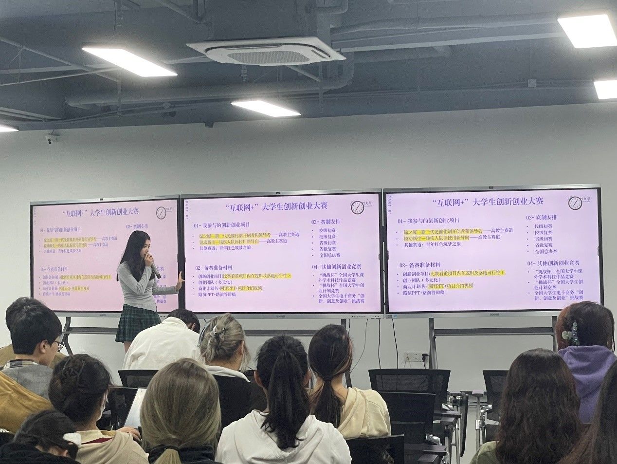 视觉传达设计专业的陈权欣向同学们介绍了我校本科生学业竞赛项目库,归纳了获取科创竞赛的信息渠道,鼓励同学们多参加比赛、多总结经验。